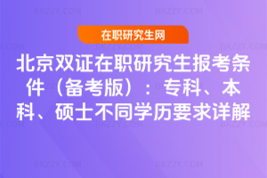 北京雙證在職研究生報(bào)考條件按學(xué)歷分層設(shè)定,專科需畢業(yè)滿5年,部分專業(yè)受限且復(fù)試可能加試;本科需畢業(yè)滿3年,有學(xué)士學(xué)位報(bào)考更靈活,無學(xué)位者需補(bǔ)充優(yōu)勢(shì)材料;碩士或博士畢業(yè)滿2年即可報(bào)考,復(fù)試有優(yōu)勢(shì)。管理類、工科類等特殊專業(yè)有額外從業(yè)經(jīng)驗(yàn)或資質(zhì)要求,部分院校還設(shè)戶籍、社保或推薦信要求。……